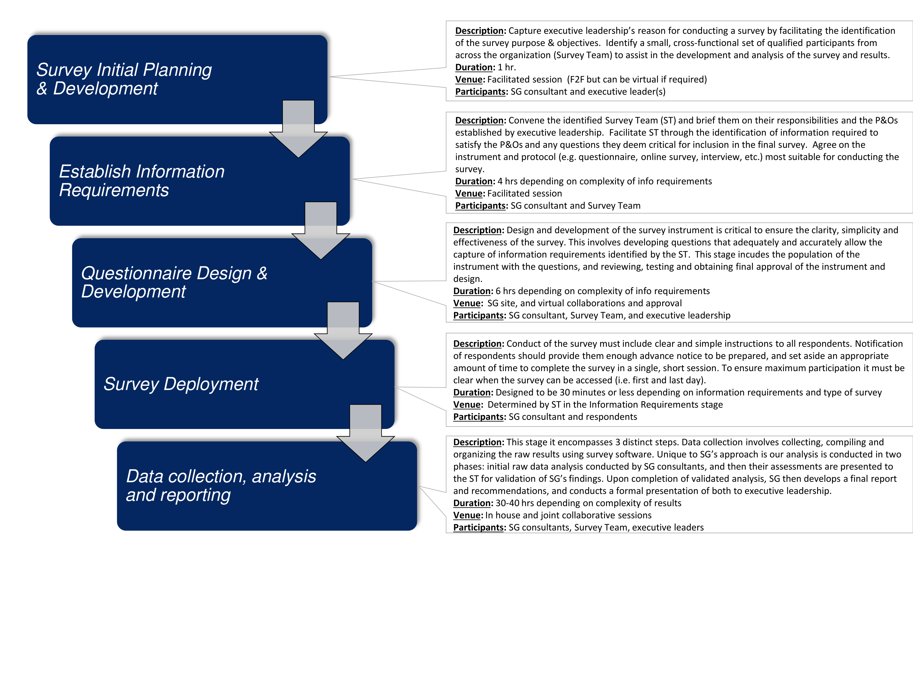 Shackleton Group’s unique and tailored approach to organizational surveys ensures you get exactly the information you need to enhance executive decision-making. Our approach to surveys not only collects the information required, but validates the raw data with a small survey team of experts before conducting any statistical analysis of the responses.